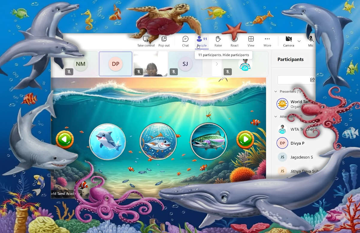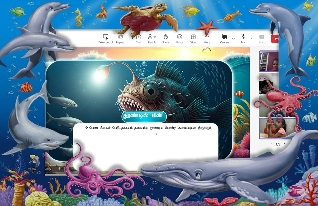 'கடல்வாழ் உயிரினங்கள்' என்ற தலைப்பில் ஒரு சிறப்பு இணையவழி வகுப்பு, ஆகஸ்ட் 19, 2025, செவ்வாய்க்கிழமை அன்று, காலை 05:00 மணி முதல் 05:30 மணி வரை (இந்திய நேரம்) நடைபெற்றது. ஆசிரியை கருணா பிரியதர்ஷினி அவர்கள், கடலின் பல்வேறு அடுக்குகளில் வாழும் உயிரினங்கள், அவற்றின் தனித்துவமான தகவமைப்புகள், மற்றும் கடலோர சுற்றுச்சூழலைப் பாதுகாப்பதில் அவற்றின் பங்கு குறித்து விளக்கினார். கடல் பாலூட்டிகள், ஆமைகள், பவளப் பாறைகள் மற்றும் பல்வேறு மீன் வகைகள் பற்றிய ஆழமான தகவல்களைப் பகிர்ந்து கொண்டார். இந்தச் சிறப்பு வகுப்பு, மாணவர்கள் மத்தியில் கடல் சூழலியல் மற்றும் பாதுகாப்பு குறித்த விழிப்புணர்வையும் ஆர்வத்தையும் அதிகரித்தது.